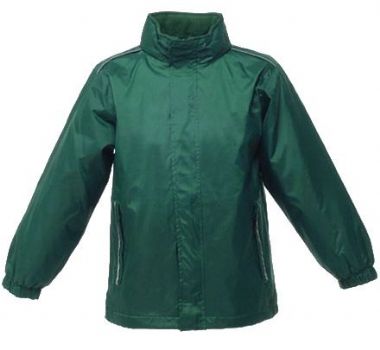 Waterproof and Windproof Jacket with fleece lining, full zip, two zipped lower pockets, concealed hood, elasticated cuffs, reflective trim to front and back and adjustable shockcord hem on sizes 7+
