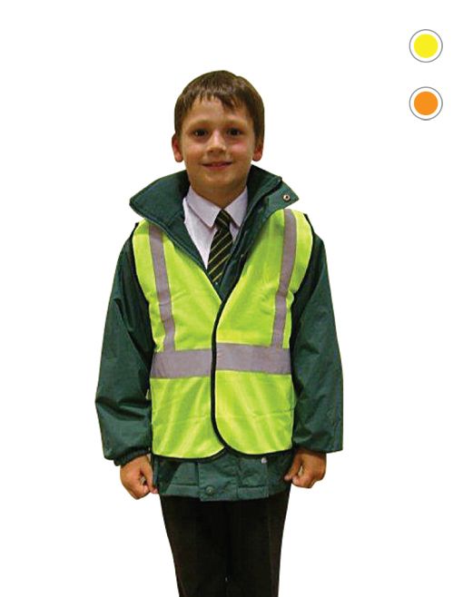 Hi-Visibility Vest with tape bound edges and velcro front fastening. Adult sizes have two bands and brace stitched reflective tape and childrens sizes have single band and brace.