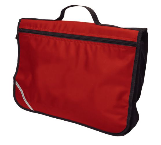 Excel Book Bag in a strong water resistant material with PVC lining and black binding on edges, maximum capacity with side and bottom gussets, external zip pocket, internal pocket, name card holder on the side, D rings at sides to attach a shoulder strap which can be bought separately.