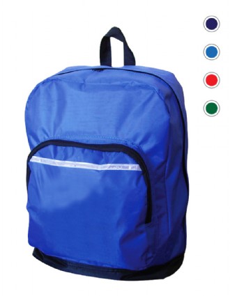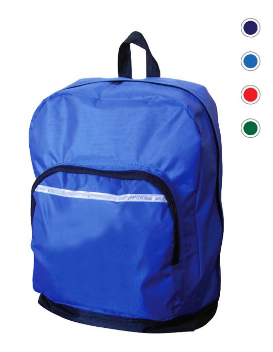 Primary Rucksack in a strong, lightweight water resistant material, features include safety reflectors back and front, mesh side pocket/bottle holder, front pocket with internal pen holders ,name card holder on the back and padded adjustable shoulder straps.