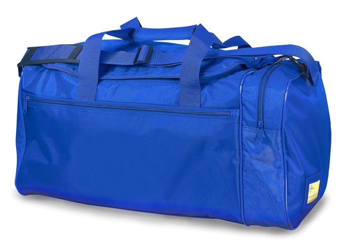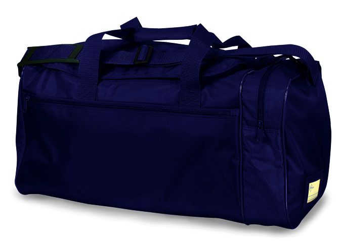 Sports Bag in a heavy duty PVC backed material with a waterproof base, handles with comfort hold strap, adjustable shoulder strap, one front ad one side pocket with zip and name card holder on the one end.