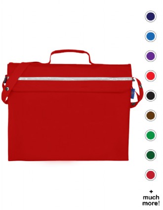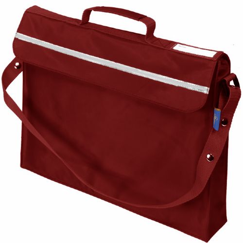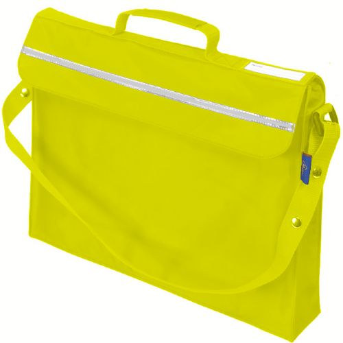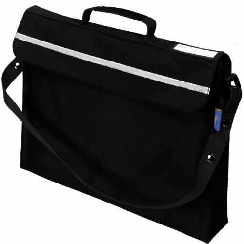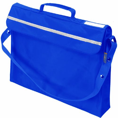 Primo Book Bag in a strong water resistant material with PVC lining, maximum capacity with side and bottom gussets, internal pencil pocket, shoulder strap, name card holder on the top, full length reflector strip and secure velcro fastening.