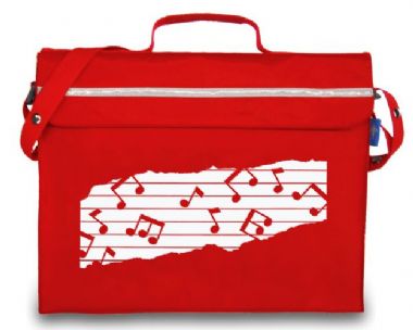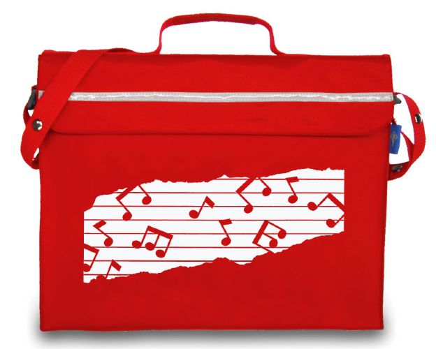 Primo Bag printed with Musical Notes Logo. A strong water resistant material with PVC lining, maximum capacity with side and bottom gussets, internal pencil pocket, shoulder strap, name card holder on the top, full length reflector strip and secure velcro fastening. Dimensions 37 x 30 x 6cm
