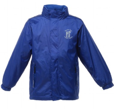 Waterproof and Windproof Jacket with fleece lining, full zip, two zipped lower pockets, concealed hood, elasticated cuffs, reflective trim to front and back and adjustable shockcord hem on sizes 7+