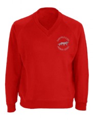 Red cardigan with school logo