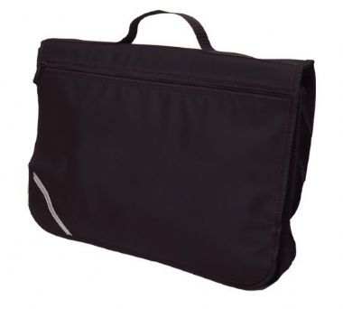 Excel Book Bag in a strong water resistant material with PVC lining and black binding on edges, maximum capacity with side and bottom gussets, external zip pocket, internal pocket, name card holder on the side, D rings at sides to attach a shoulder strap which can be bought separately.