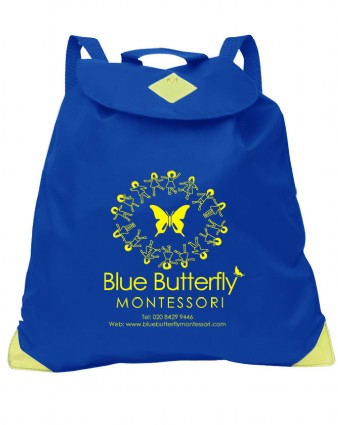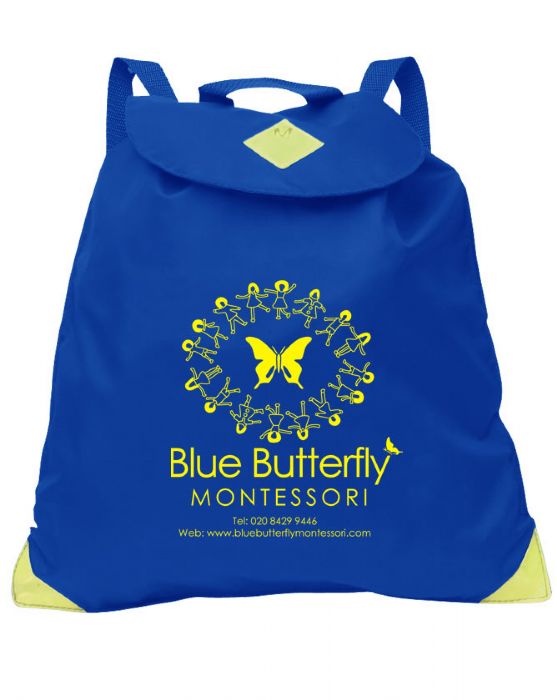 Infant Backpack in a strong water resistant material, features include secure easy to open velcro fasting, strong drawcord, safety reflectors, internal pocket, name card holder on the back and adjustable back straps.
