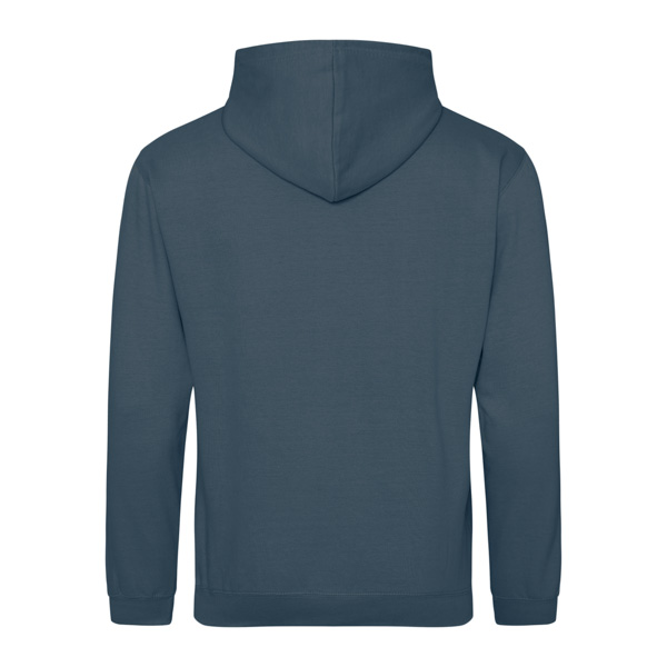 College Hoodie with kangaroo pouch pocket, ribbed cufs and hem, double fabric hood, no drawcords on childrens sizes to comply with EU regulation