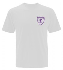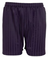 of purple/black shorts/tracksuit bottoms, white P.E. shirt and daps/trainers.
