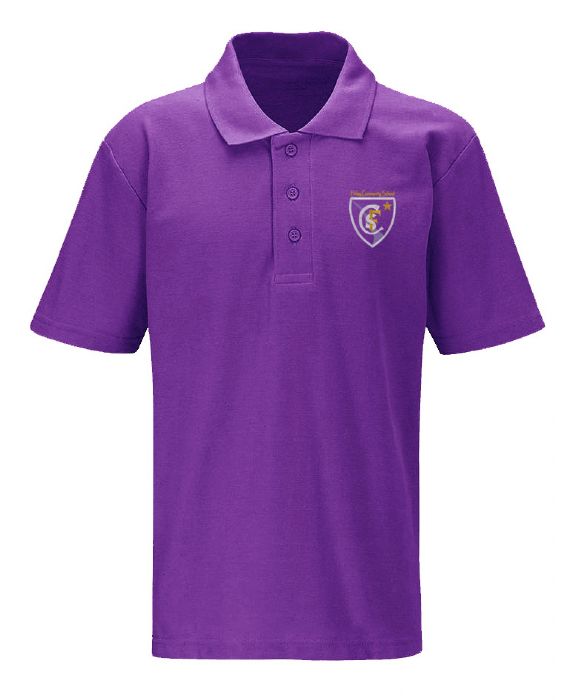 School uniform consists of purple sweatshirt or cardigan, white polo shirt, black/grey