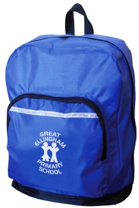 Primary Rucksack in a strong, lightweight water resistant material, features include safety reflectors back and front, mesh side pocket/bottle holder, front pocket with internal pen holders ,name card holder on the back and padded adjustable shoulder straps.