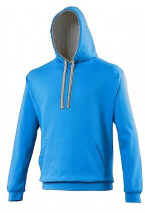 Varsity Hoodie with kangaroo pouch pocket, ribbed cufs and hem, double fabric hood with contrast colour inner, no drawcords on childrens sizes to comply with EU regulation