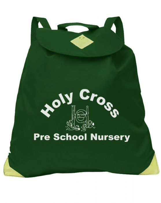 Infant Backpack in a strong water resistant material, features include secure easy to open velcro fasting, strong drawcord, safety reflectors, internal pocket, name card holder on the back and adjustable back straps.