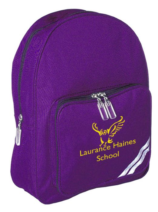 Infant Backpack with front pocket containing pen holder and detachable pencil case, one zipped compartment, shoulder straps have Blazer Buddy lining to avoid piling of garment and special rubber feet protectors. Dimensions 14 x 9 x 6 inches