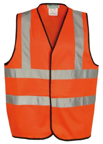Hi-Visibility Vest with tape bound edges and velcro front fastening. Adult sizes have two bands and brace stitched reflective tape and childrens sizes have single band and brace.