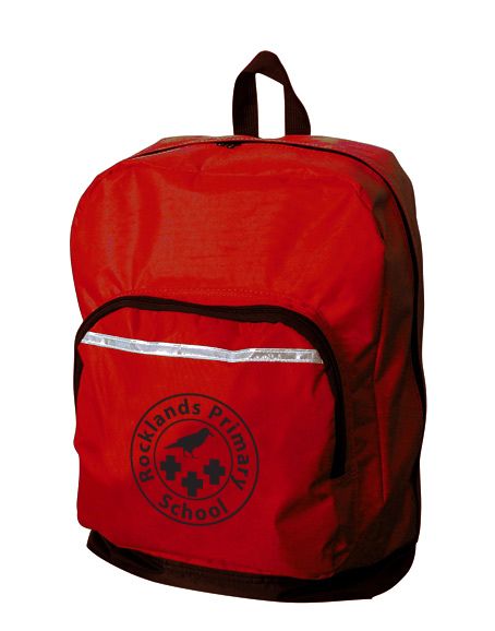 Primary Rucksack in a strong, lightweight water resistant material, features include safety reflectors back and front, mesh side pocket/bottle holder, front pocket with internal pen holders ,name card holder on the back and padded adjustable shoulder straps.