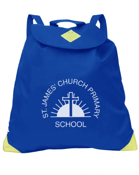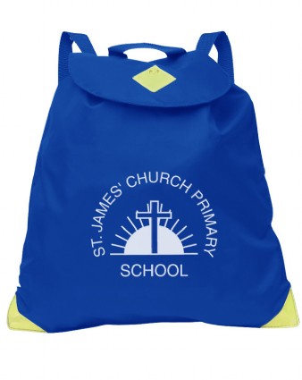 Infant Backpack in a strong water resistant material, features include secure easy to open velcro fasting, strong drawcord, safety reflectors, internal pocket, name card holder on the back and adjustable back straps.