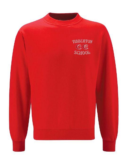 Sweatshirt: Bright red with Tibberton insignia, crew neck ( from school or online)