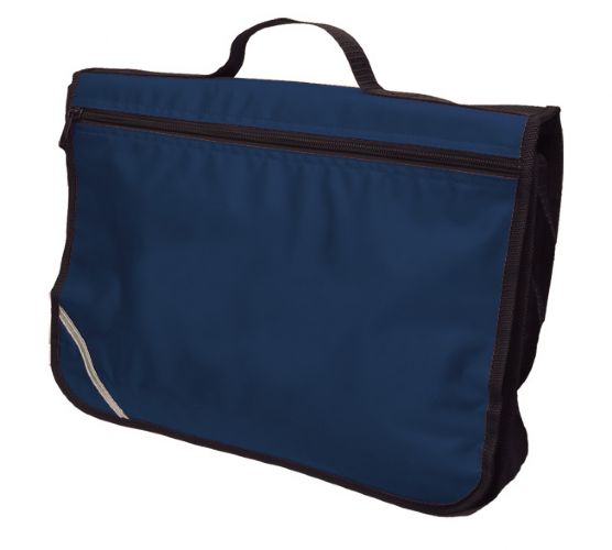 Excel Book Bag in a strong water resistant material with PVC lining and black binding on edges, maximum capacity with side and bottom gussets, external zip pocket, internal pocket, name card holder on the side, D rings at sides to attach a shoulder strap which can be bought separately.