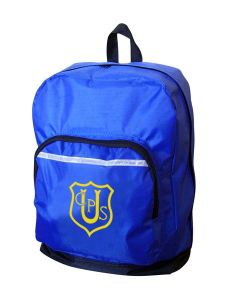 Primary Rucksack in a strong, lightweight water resistant material, features include safety reflectors back and front, mesh side pocket/bottle holder, front pocket with internal pen holders ,name card holder on the back and padded adjustable shoulder straps.