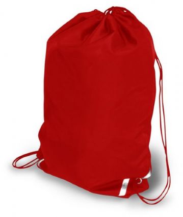 Junior Kit Bag in an extra strong water resistant material , rucksack style draw cords, internal pocket, safety reflectors on corners, peg hook and name card holder on the back.