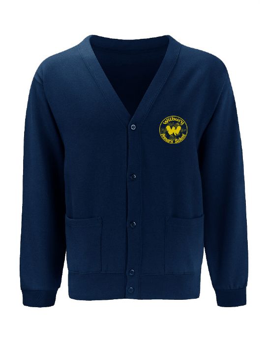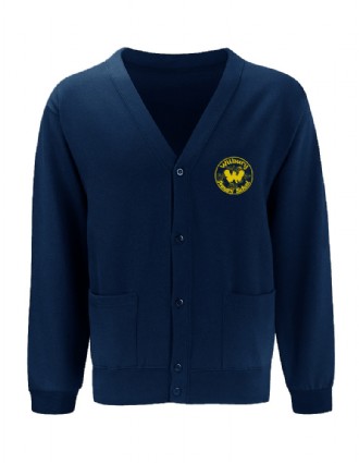 Navy blue school sweatshirts or cardigans with the school logo in the top corner, white shirts, blouses or white school polo shirts. School ties in navy with a thin yellow stripe, elasticated for younger children.